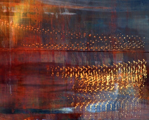 rusting paint on ships’ hulls. With my camera on the high seas I capture fascinating patterns and characters from weathered and repainted ship’s steel. I am a lifelong self-trained artist, and currently give my creativity free reign as a seaman on the San Francisco pilot boat, stationed 12 miles outside the Golden Gate. While pilots go up and down the Jacob’s ladders in near hourly intervals, I stand camera-ready on deck of the pilot boat, down near the waterline, where the best motifs for my fleeting photography offer themselves so wonderfully. Here for mere moments I find myself presented with surprising views of patterns of worn paint — a rare perspective that most people are never privy to.