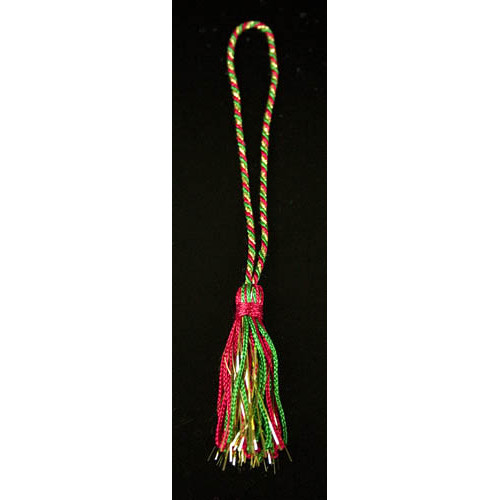 What a festive, dazzling tassel! Our Christmas Tinsel Twist is similar to Christmas Striped Tassel, except it is a little fancier, with a third twist of gold tinsel to complement the Red and Emerald.